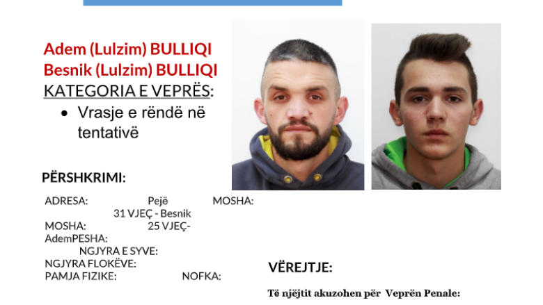 Policia njofton se Adem dhe Besnik Bulliqi ishin në kërkim për veprën penale “Vrasje e rëndë e mbetur në tentativë”, e ndodhur më 13 korrik në Pejë, transmeton Telegrafi.