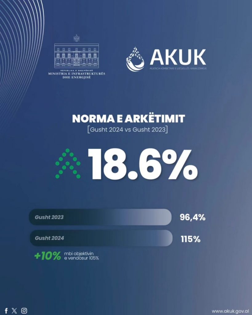 “Edhe muaji gusht faktoi ecurinë pozitive të treguesve në sektorin e ujësjellës-kanalizimeve. 18.6% norma e arkëtimit, krahasuar me muajin gusht të vitit të kaluar. Reforma që ndërmorëm në sektor po jep rezultate positive”, u shpreh ajo.