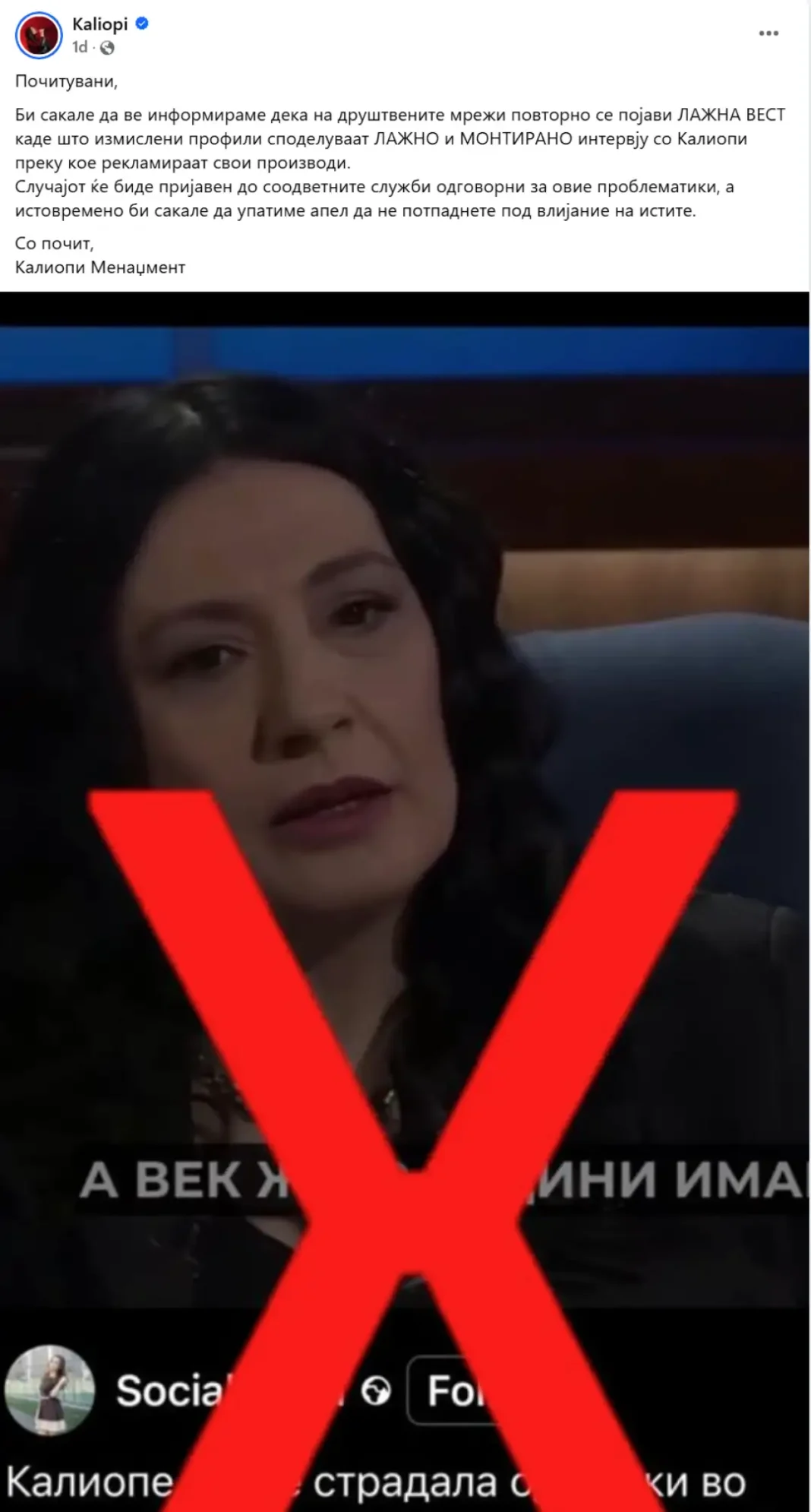 I fundit i një serie rastesh të tilla ishte abuzimi me identitetin e këngëtares së famshme Kaliopi, zëri i të cilit u ndryshua me veglat e inteligjencës artificiale. Në rrjetin social Fejsbuk është krijuar një video, e cila, meqë ra fjala, ende nuk është hequr, në të cilën “ajo” gjoja flet për gjendjen e saj gjoja të diagnostikuar, ndërsa mjeku që gjoja e ka ndihmuar është mjeku ynë Nikolla Panovski, i cili gjoja është “bllokuar” nga politikanët për shkak se “e ka foluar të vërtetën” për kompanitë farmaceutike. Kaliopi reagoi menjëherë në rrjetet e saj sociale, duke e mohuar atë postim në Fejsbuk.