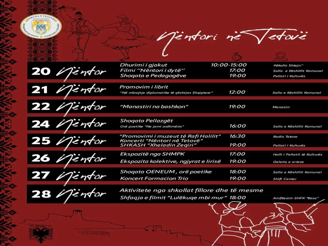Shkup, 19 nëntor – Për nder të festave të Nëntorit, Komuna e Tetovës do të shënojë këto ditë festive me aktivitete të ndryshme kulturore dhe artistike.