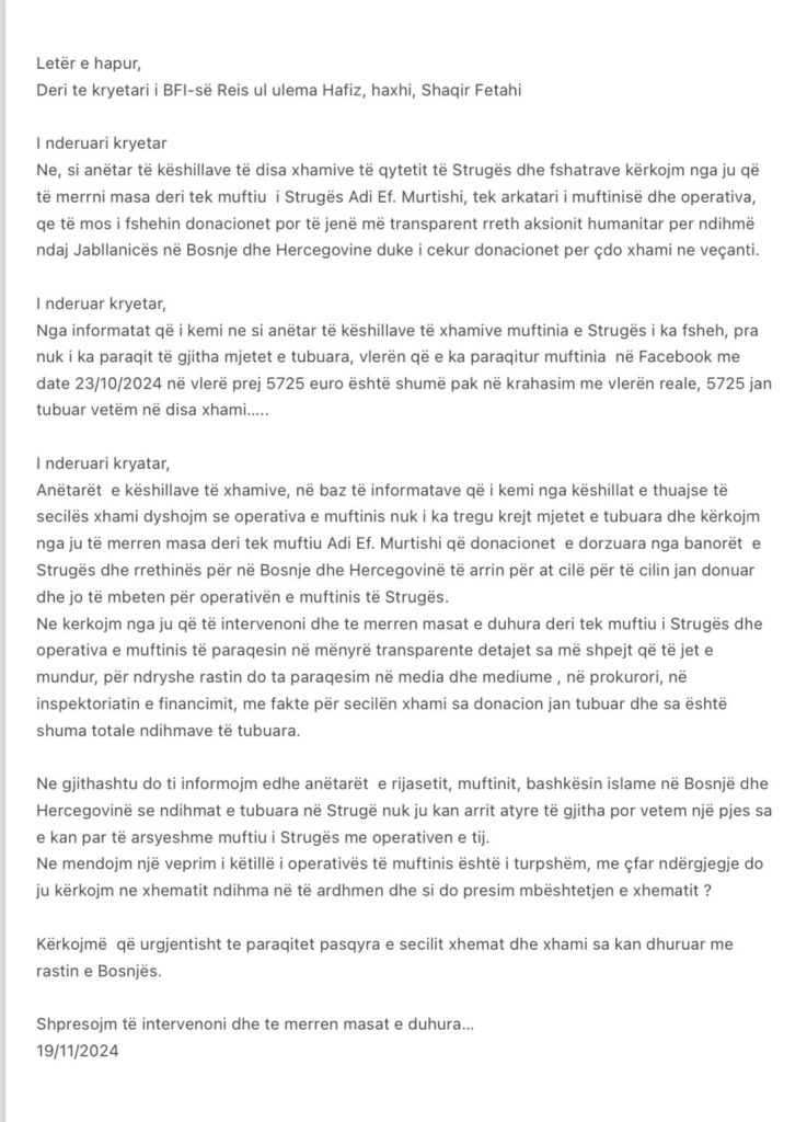 Ne, si anëtar të këshillave të disa xhamive të qytetit të Strugës dhe fshatrave kërkojm nga ju që të merrni masa deri tek muftiu i Strugës Adi Ef. Murtishi, tek arkatari i muftinisë dhe operativa, qe të mos i fshehin donacionet por të jenë më transparent rreth aksionit humanitar per ndihmë ndaj Jabllanicës në Bosnje dhe Hercegovine duke i cekur donacionet per çdo xhami ne veçanti.