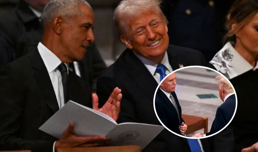 Trump dhe Obama folën vazhdimisht përpara shërbimit të varrimit, me Obaman duke tundur kokën në përgjigje të Trumpit përpara se të buzëqeshte.