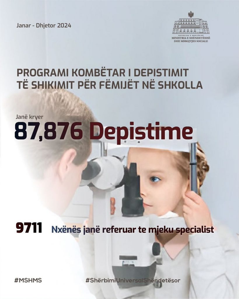 Mbi 87 mijë fëmijë kanë përfituar nga programi kombëtar i depistimit të shikimit në shkolla. Ministrja e Shëndetësisë dhe Mbrojtjes Sociale ndau sot shifrat e rezultateve, pas integrimit të këtij programi në shkollat e vendit, duke evidentuar se 9711 nxënës janë referuar për vizitë tek mjeku specialist për ndjekjen e problematikave të shfaqura.