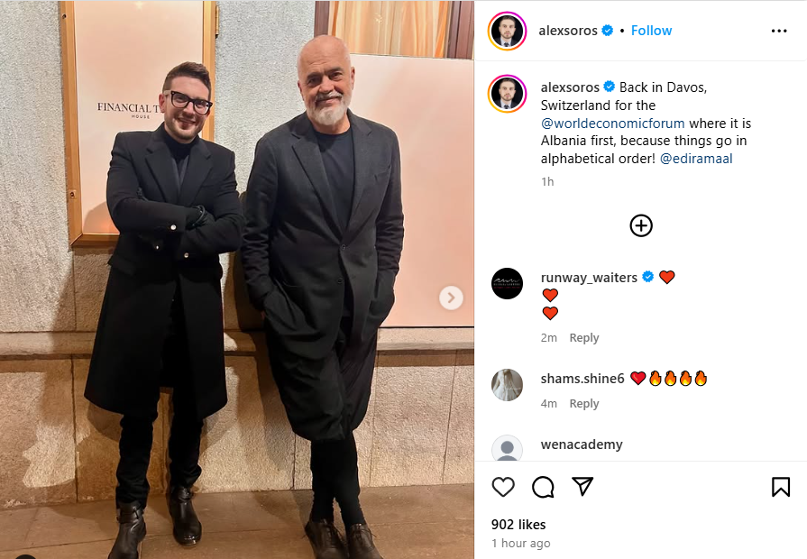 “Kthim në Davos të Zvicrës për Forumin Ekonomik Botëror, ku Shqipëria është e para, sepse gjërat shkojnë sipas rendit alfabetik”, shkruan Soros duke etiketuar kryeministrin Rama.