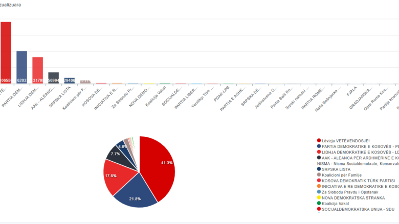 Sipas këtyre rezultateve, Lëvizja Vetëvendosje kryeson me 41.29% apo 306,556 vota, e ndjekur nga Partia Demokratike e Kosovës me 21.83% apo 162,033 vota dhe Lidhja Demokratike e Kosovës me 17.75% apo 131,798 vota.