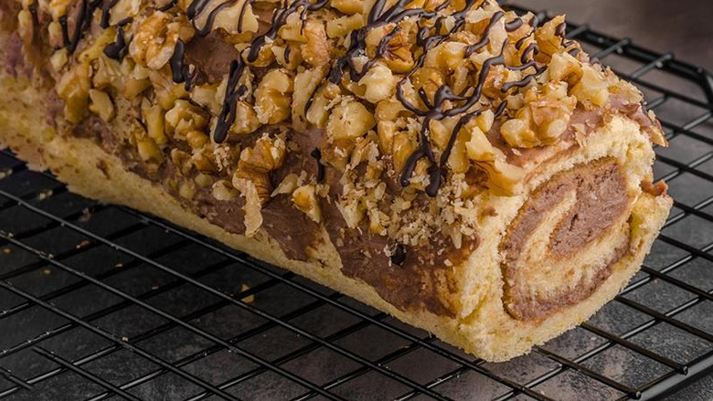 Kur të ftohet, qitni fillin dhe sërish rrotullojeni. Shkrini çokollatën me gjalpë dhe hidhni lajthitë e grira, pastaj rolesë së ftohur qitni glazurën.