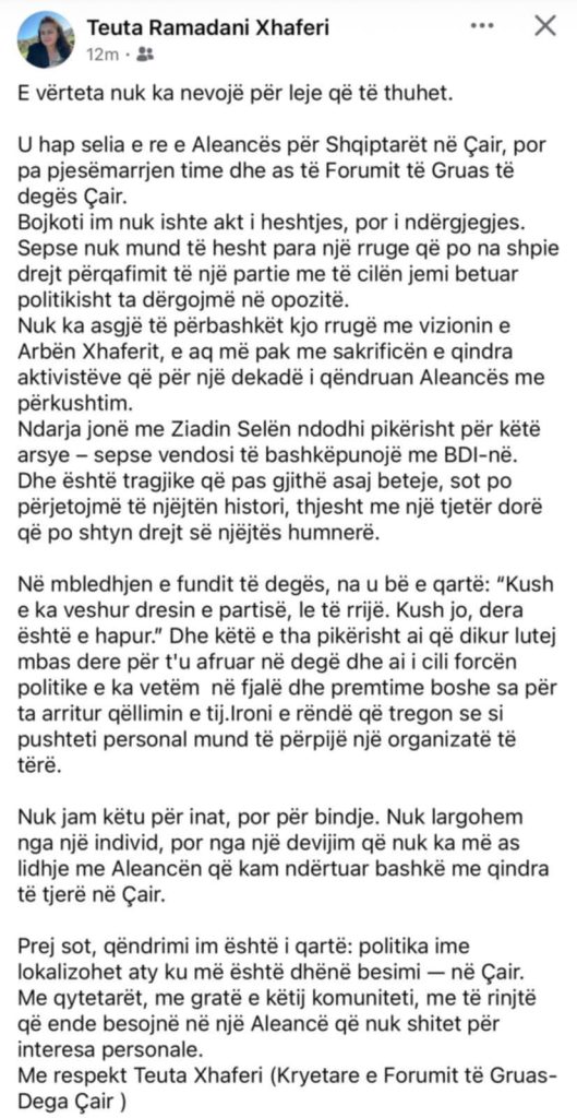 Nuk jam këtu për inat, por për bindje. Nuk largohem nga një individ, por nga një devijim që nuk ka më as lidhje me Aleancën që kam ndërtuar bashkë me qindra të tjerë në Çair.