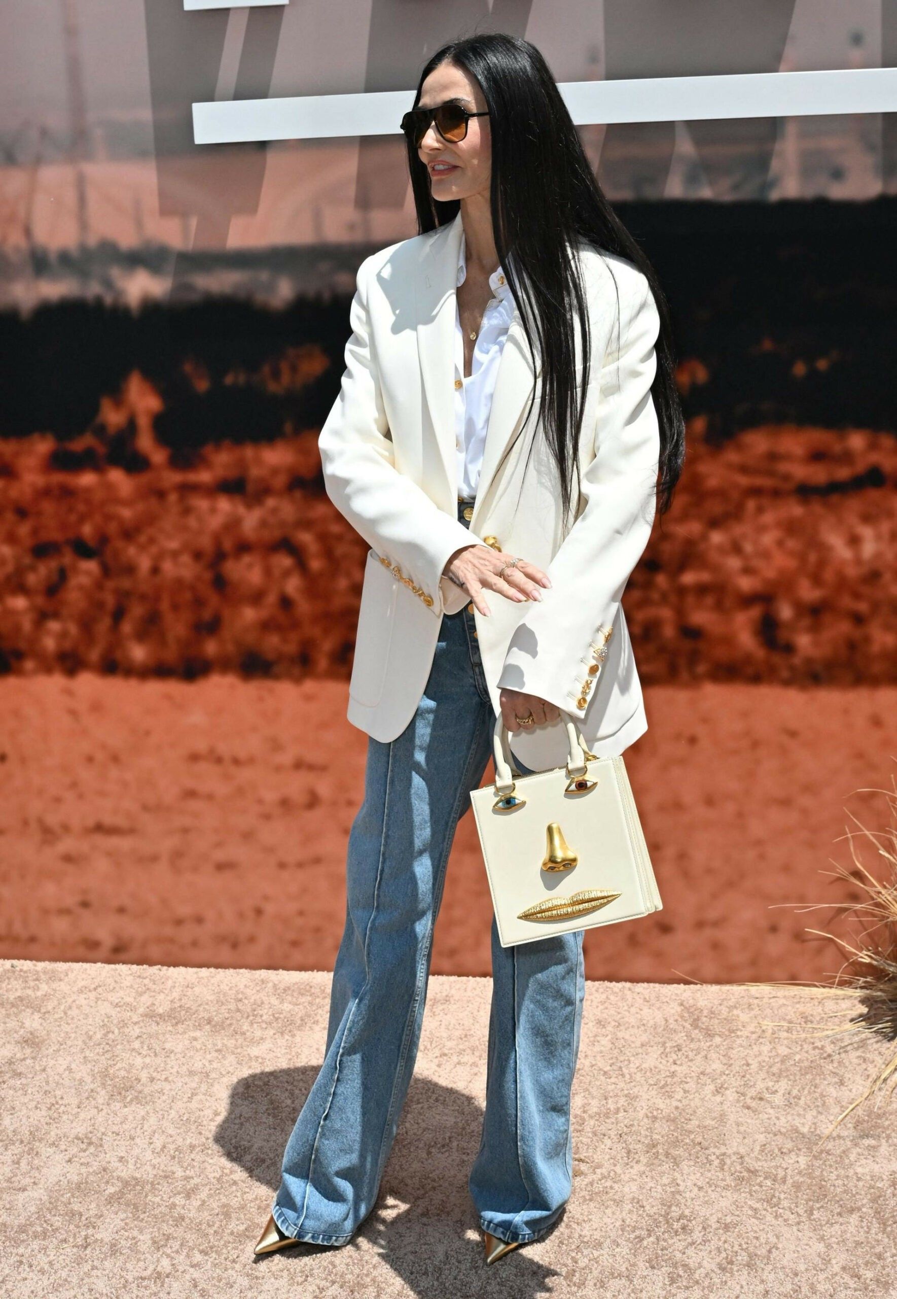 Demi tërhoqi vëmendjen me një kombinim të markës Schiaparelli, një këmishë e bardhë e thjeshtë, një xhaketë me detaje në ngjyrë ari dhe xhinse me një rresht kopsash.