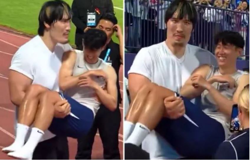Ylli i Tottenhamit, Son Heung-min, u përqafua si një foshnjë nga një ish-yll i MMA-së, 2.98 m i gjatë, në një seancë stërvitore të hapur në Seoul.