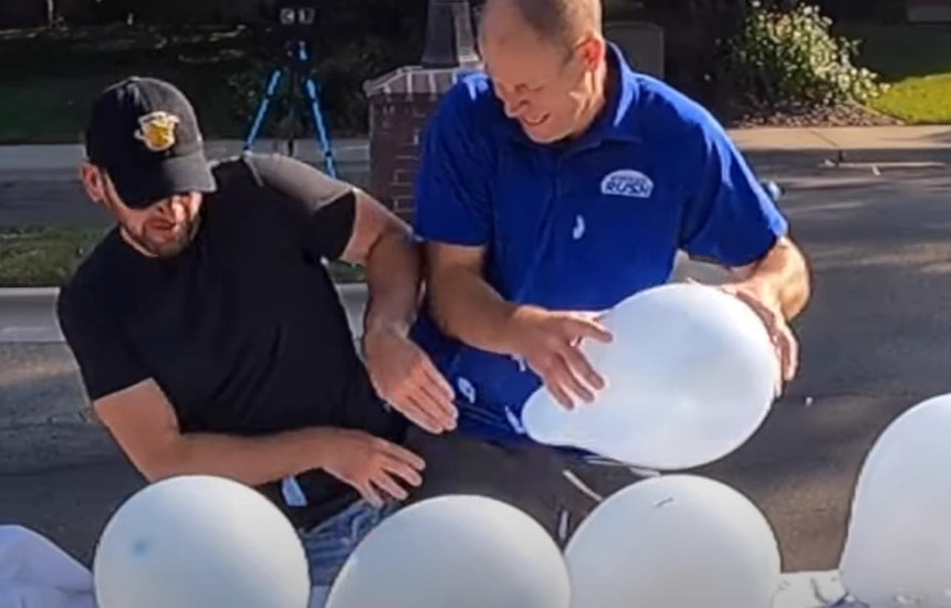 David Rush, një rekordmen i njohur i Rekordeve Botërore Guiness, ka thyer një rekord të ri jozyrtar kur ai dhe një mik i tij shpërthyen 10 balona mes trupave të tyre për 7.5 sekonda.