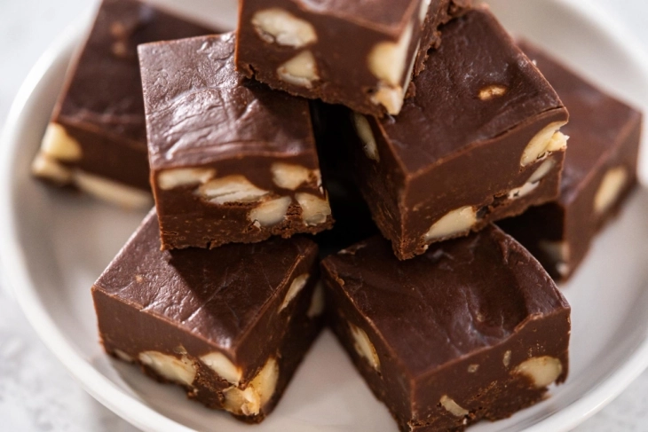 Ngrohni ujin në një tenxhere dhe mbi të vendosni një enë që i reziston nxehtësisë me çokollatë të grirë sipër për ta shkrirë në avull. Pasi çokollata të jetë shkrirë, shtoni qumështin e kondensuar dhe përziejini derisa mikstura të bëhet e lëmuar. Nëse dëshironi, shtoni aromë vaniljeje ose rumi dhe pak kanellë ose erëza të tjera. Mbuloni një tepsi të vogël pjekjeje me letër pjekjeje. Mund t’i përzieni të gjitha lajthitë me miksturën e çokollatës ose të hidhni disa prej tyre në mes. Hidheni miksturën në tepsi dhe rrafshojeni. Lëreni të qëndrojë gjatë natës në frigorifer.