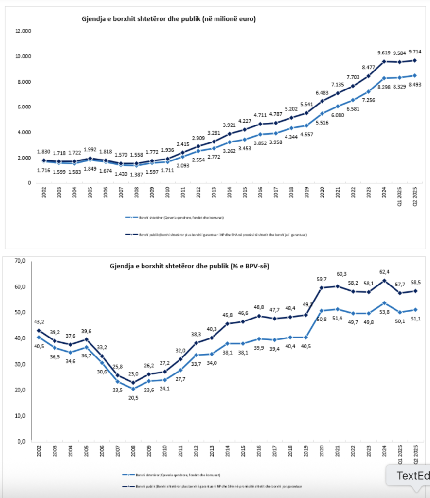 Borxhi publik ende nuk tejkalon pragun prej 60 përqind të PBB-së. Sipas të dhënave të publikuara nga ana e ministrisë së financave, borxhi public në Maqedoninë e Veriut në kuartalin e dytë të vitit 2025 është 58.5 për qind, ndërsa borxhi shtetëror është 51.1 për qind.